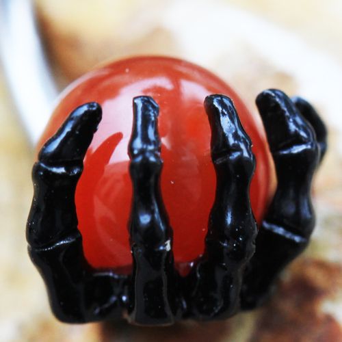 Red glass ball as the crystal ball creates vibrant, magical beauty. The red glass creates a rich, glowing appearance that looks like a real fortune teller's crystal ball. Red represents passion, power, and mystery. The glass ball adds dimension and color to the skeleton hand design, creating a beautiful focal point.